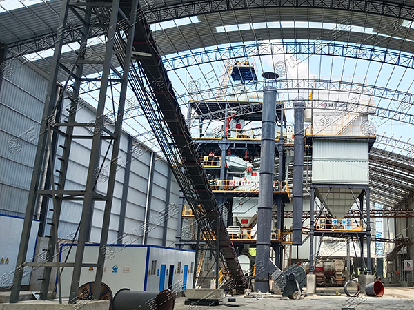 原料經(jīng)過電子秤進(jìn)入到皮帶輸送機(jī)中,由全封閉的提升機(jī)將物料入到五孔碾磨制砂機(jī)內(nèi)進(jìn)行破碎處理,再由空氣篩對破碎后的物料進(jìn)行篩分、選粉處理,篩分后的較大物料會返回五孔碾磨制砂機(jī)中進(jìn)行二次破碎,符合要求的砂子則經(jīng)加濕拌合機(jī)處理后由傳送帶輸送至成品倉中;篩分過程中的粉塵會經(jīng)粗細(xì)粉分離機(jī)進(jìn)入到布袋收塵器內(nèi),而其中較大的粗顆粒會在粗細(xì)粉分離機(jī)的作用下,按需求在成品砂中進(jìn)行回?fù)?,?xì)粉塵將通過風(fēng)力進(jìn)入到布袋收塵器,作為副產(chǎn)品進(jìn)行使用。